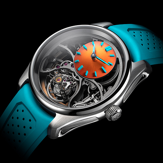 仕様:時・分表示、6時位置のミニッツ フライング トゥールビヨン、オレンジのドーム型フュメダイアル、スケルトンダイアル、ターコイズブルーのグロボライト®のインデックス、ターコイズブルーのグロボライト®インサート付きの時・分針、シースルーケースバック