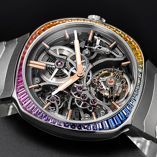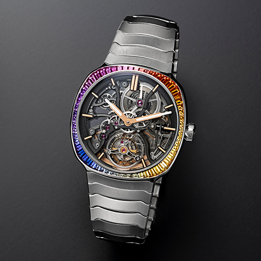 仕様:時・分表示、6時位置のミニッツ フライング トゥールビヨン、ミドルケースに60個のバゲットカットのカラーサファイア(2.90カラット)をセッティング、フルスケルトンダイアル、5Nゴールドプレート仕上げを施したファセット加工のインデックス、5Nゴールドプレート仕上げを施したグロボライト®インサート付きの時・分針、シースルーケースバック