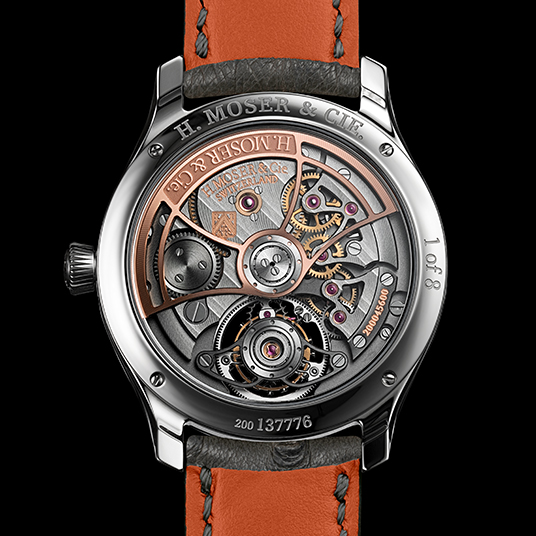 ストラップ:手縫いのグレー オーストリッチレザー、H.モーザーのロゴが刻印されたステンレススチールのフォールディングクラスプ