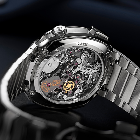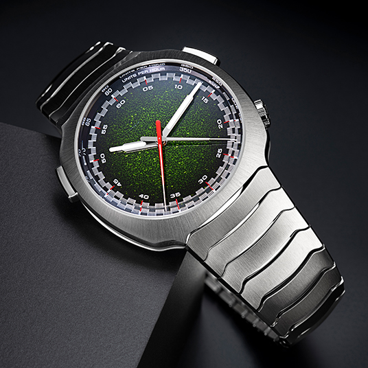 仕様:時・分表示、センター表示を採用し経過分および秒を表示するクロノグラフ、分および秒のフライバック、フロスト仕上げのマトリックスグリーン フュメダイアル、グロボライト®インサート付きの時針および分針、レッドのクロノグラフ針、フランジのタキメーター、シースルーケースバック