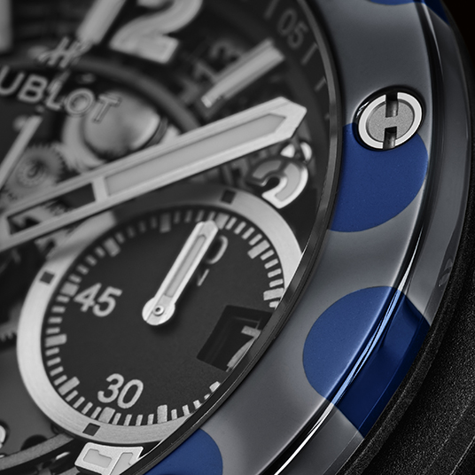 仕様:時・分・秒・日付表示、フライバック クロノグラフ、ポリッシュ仕上げを施したバイカラーブラックセラミックベゼル(トワイライトブルーのドット柄)、マットブラックダイアル、サファイアクリスタルケースバック