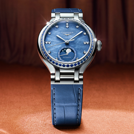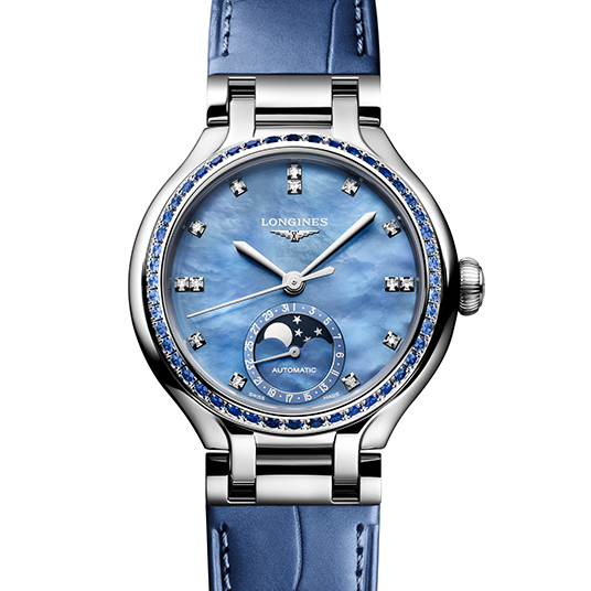 仕様:時・分・秒表示、6時位置にムーンフェイズ表示とカレンダー、ベゼルに48粒のサファイアをセット、ブルー・マザー・オブ・パールダイアルに14粒のトップ・ウェッセルトン・ダイヤモンドをセット、シースルーケースバック