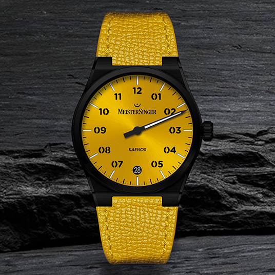仕様:シングルハンドによる時刻表示、日付表示、サンバースト・ゴールデンイエローダイアル、シースルーケースバック