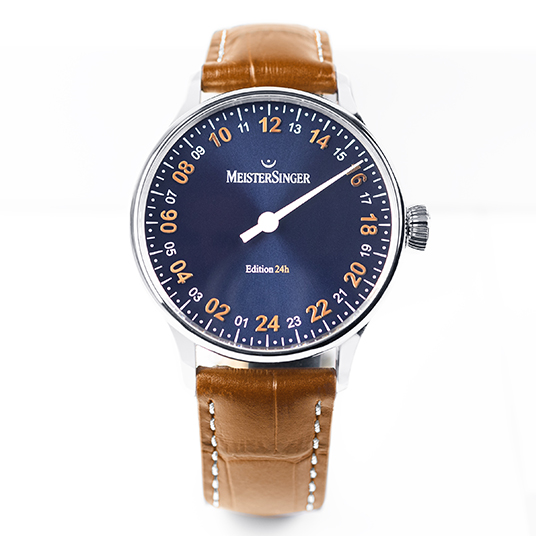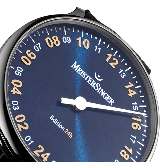 仕様:シングルハンドによる24時間の時刻表示、サンバースト仕上げのスチールブルーダイヤル、ゴールドアクセント、シースルーケースバック