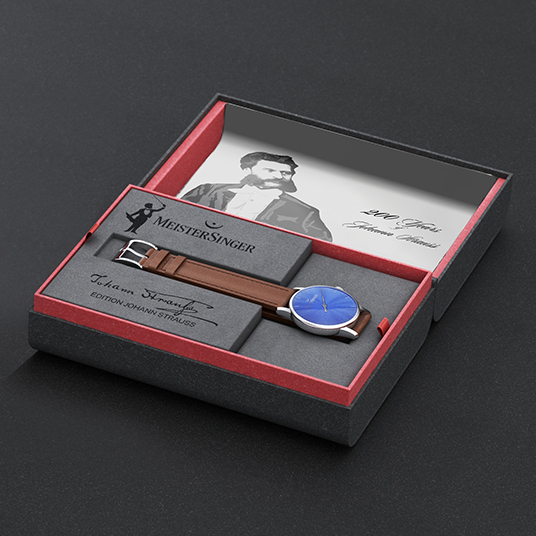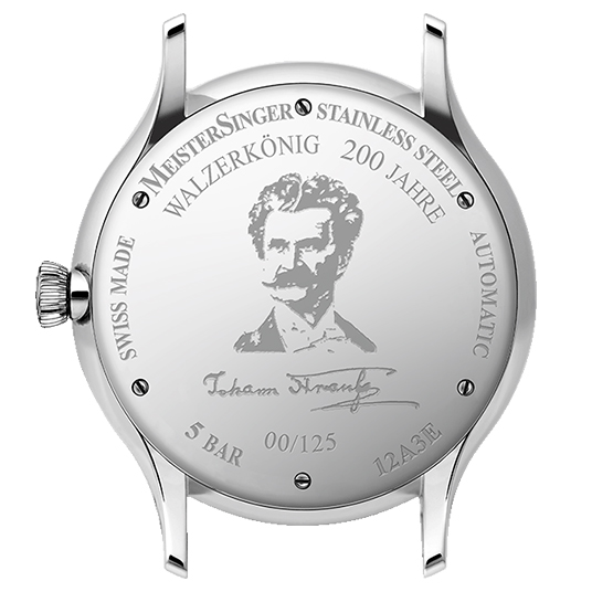 仕様:シングルハンドによる時刻表示、波状テクスチャー入りダークブルーダイヤル、ケースバックにシュトラウスの肖像とサインと限定番号を刻印