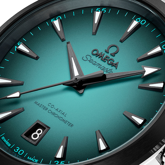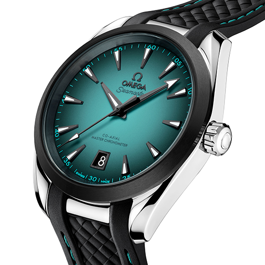 仕様:時・分・秒・日付表示、ブラックセラミック製ベゼル、内側に無反射コーティングを施したサファイアクリスタル製のドーム型風防ガラス、ターコイズダイアル、ホワイトのスーパールミノヴァを塗布したアワーマーカーと針、シースルーケースバック