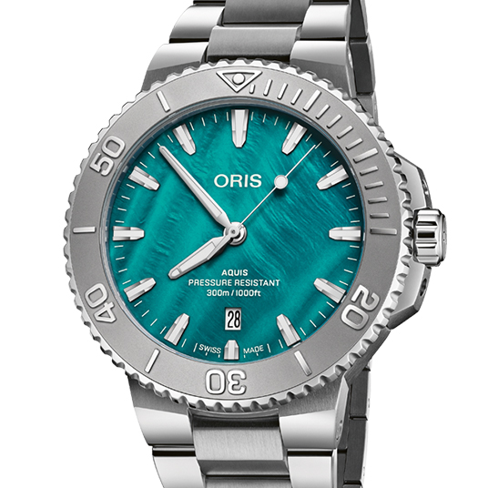 仕様:時・分・秒・日付表示、ステンレススチールインサート及びレリーフ装飾ミニッツスケール付き逆回転防止ベゼル、アクアグリーン・マザーオブパールダイアル、針とインデックスにスーパーミノルバ®、スペシャルエングレービング入りのねじ込み式ケースバック