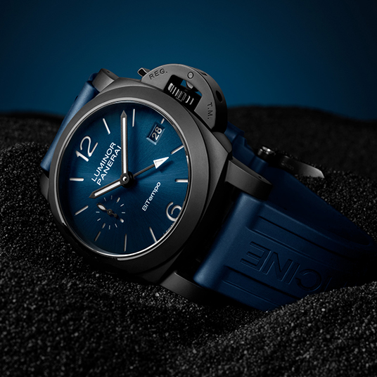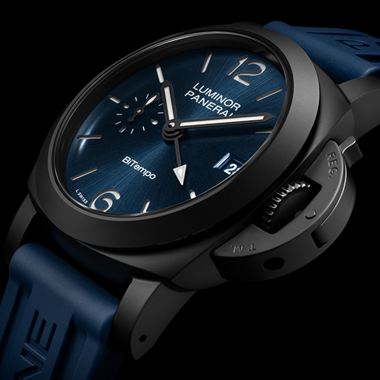 ストラップ:ブルーラバー、PAMクリックリリースシステム™のストラップとバックル、ホワイトステッチ入りブラックカーフのスペアストラップが付属