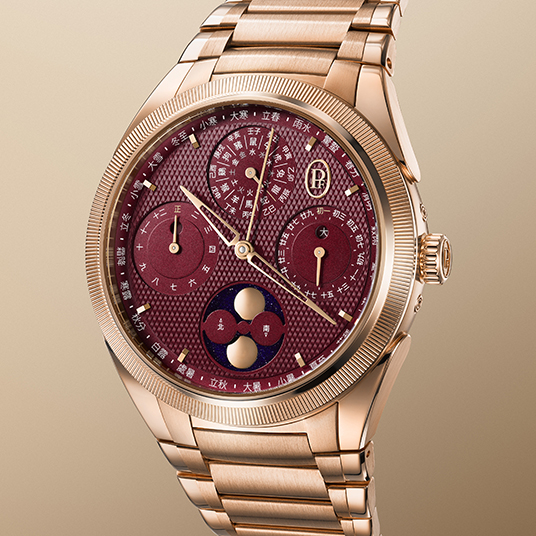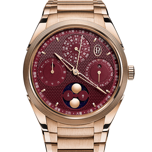 仕様:時・分表示、コンプリートチャイニーズカレンダー、高精度ムーンフェイズ、バーリーコーン(麦の穂)パターンのギョーシェを施したインペリアルレッドダイヤル、ローレット加工ベゼル、シースルーケースバック