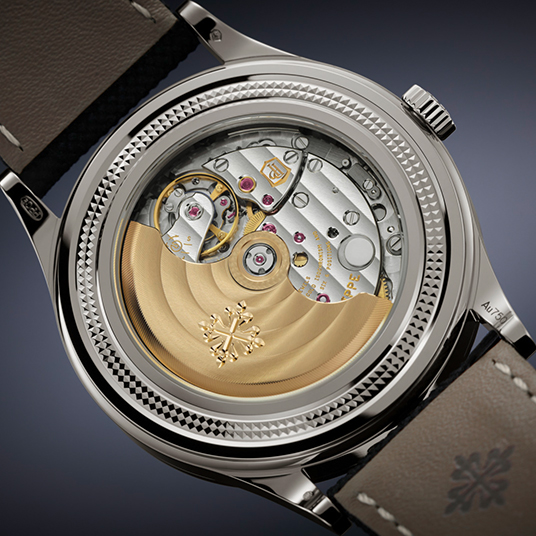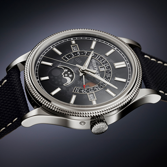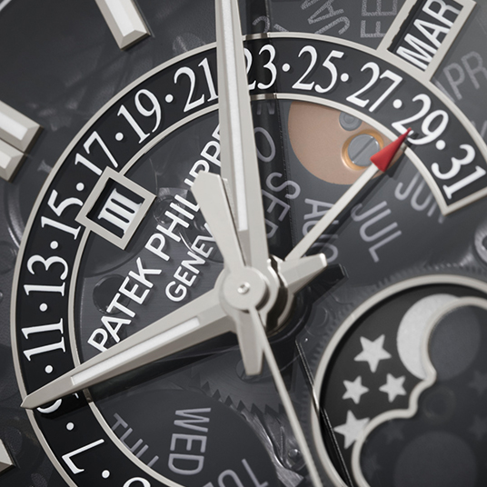仕様:時・分・秒・日付(レトログラード式)・曜日・月・閏年サイクル表示、ムーンフェイズ、外周に向かって濃くなるブラック・グラデーションのグレー・メタライズ・サファイヤクリスタル文字盤、サファイヤクリスタル・バック、パテック フィリップ・シール