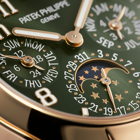 仕様:時・分・日付・曜日・月・閏年表示、ムーンフェイズ、オリーブグリーン・ソレイユ文字盤、サファイヤクリスタル・バック、パテック フィリップ・シール