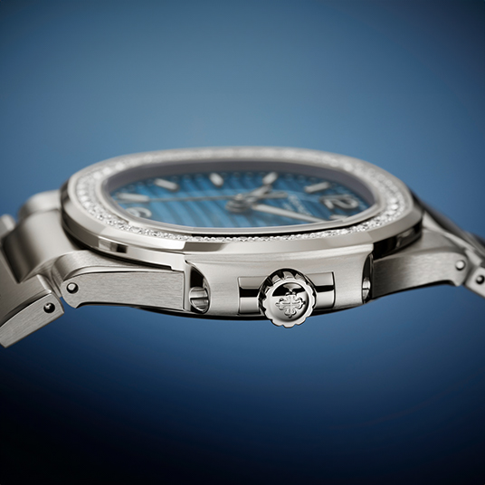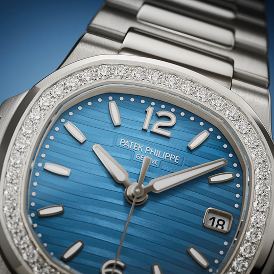 仕様:時・分・秒・日付表示、《波形》模様のラック・アズールブルー文字盤、ベゼルに46個のダイヤモンド(0.8カラット)をセッティング