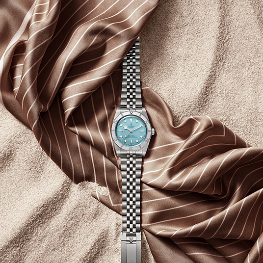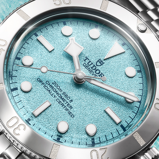仕様:時・分・秒表示、秒針停止機能、ステンレススチール製60分逆回転防止ベゼルに細かい分目盛りを省いたミラーポリッシュ仕上げのスチール製インサート、テクスチャード加工を施したドーム型のラグーンブルーダイアル、ステンレススチール製スクリュー式リューズにチューダーローズのレリーフ