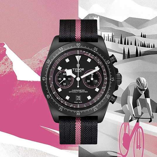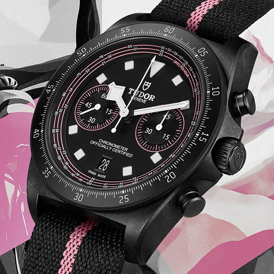 仕様:時・分・秒表示、クロノグラフ、45分積算カウンター(3時位置)、スモールセコンド針(9時位置)、瞬時に変わる日付表示(6時位置)、禁止時間帯なし秒針停止機能による正確な時刻設定、60分目盛り固定ベゼル、チタニウム製リューズ、チューダーのシールドロゴのレリーフ、マットブラックダイアル、クロノグラフカウンターとタキメーター目盛りにピンクのアクセント