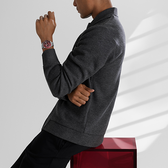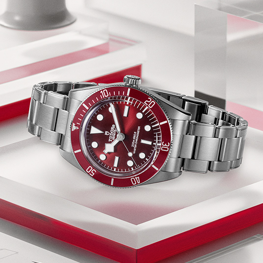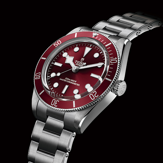 仕様:時・分・秒表示、ステンレススチール製逆回転防止ベゼルにバーガンディのアルマイト加工インサート、ドーム型のバーガンディダイアル、アプライドアワーマーカー、ステンレススチール製スクリュー式リューズにチューダーローズのレリーフ