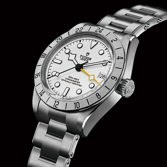 仕様:時・分・秒・日付表示、GMT、ステンレススチール製固定ベゼルに24時間目盛り、ドーム型のオパラインダイアル、ステンレススチール製スクリュー式リューズにチューダーローズのレリーフ