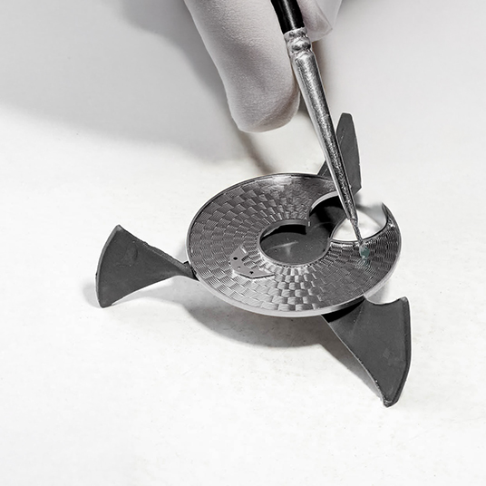 仕様:時・分表示、自軸を中心に回転するフライング・カルーセル・ムーブメント、ホワイトのスーパールミノバ®を施したルテニウムメッキ真鍮製ミニッツブリッジ、このエディションのために特別に開発された洗練されたギヨシェ・フランケ・グレーエナメル製アワーディスク、エナメル文字盤上のアワーホイール横に透明な「DONZE EMAIL(ドンツェ エナメル)」の文字、シースルーケースバック