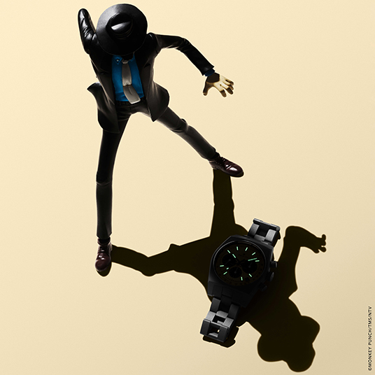 仕様:時・分・秒(スモールセコンド)・日付表示、クロノグラフ、ベージュ文字盤、ブラックのクロノグラフカウンター、ルテニウムプレート加工のアプライドインデックスと針にスーパールミノバ®SLNを塗布、サファイアガラスの裏蓋に次元大介のシルエットを刻印