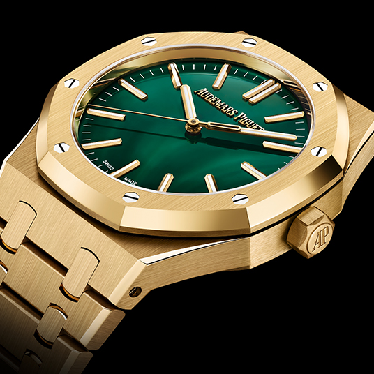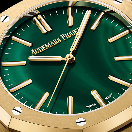 仕様:時・分・秒表示、ポリッシュ仕上げのマラカイトダイヤル、蓄光加工が施された18Kイエローゴールドのアワーマーカーとロイヤル オーク針、イエローゴールドカラーのインナーベゼル、サファイアケースバック