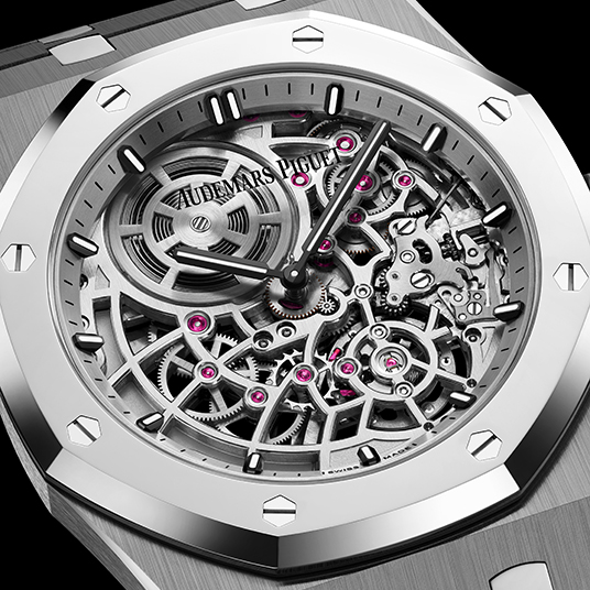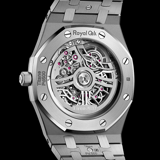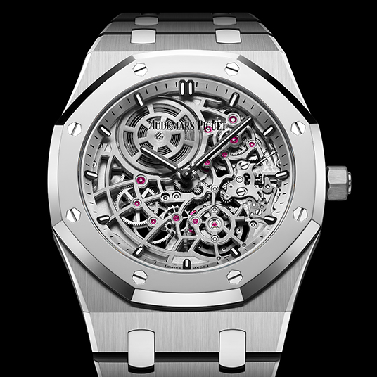 仕様:時・分表示、ロジウムカラーのオープンワークダイヤル、ブラック加工18Kホワイトゴールドの長方形アワーマーカーと蓄光加工が施されたロイヤル オーク針、シルバーグレーカラーのインナーベゼル、サファイアケースバック