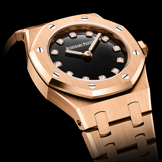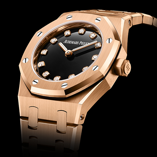 仕様:時・分表示、ブラックオニキスのダイヤル、ブリリアントカット ダイヤモンドセットのアワーマーカー、蓄光加工を施した18Kピンクゴールドのロイヤル オーク針
