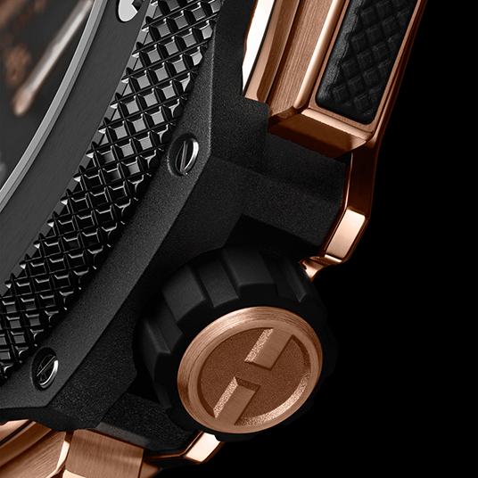 ストラップ:ブラックのストラクチャード ラバーストラップ、18Kキングゴールドとブラックプレート チタニウム製デプロイアントバックル、「ワンクリック」システム搭載